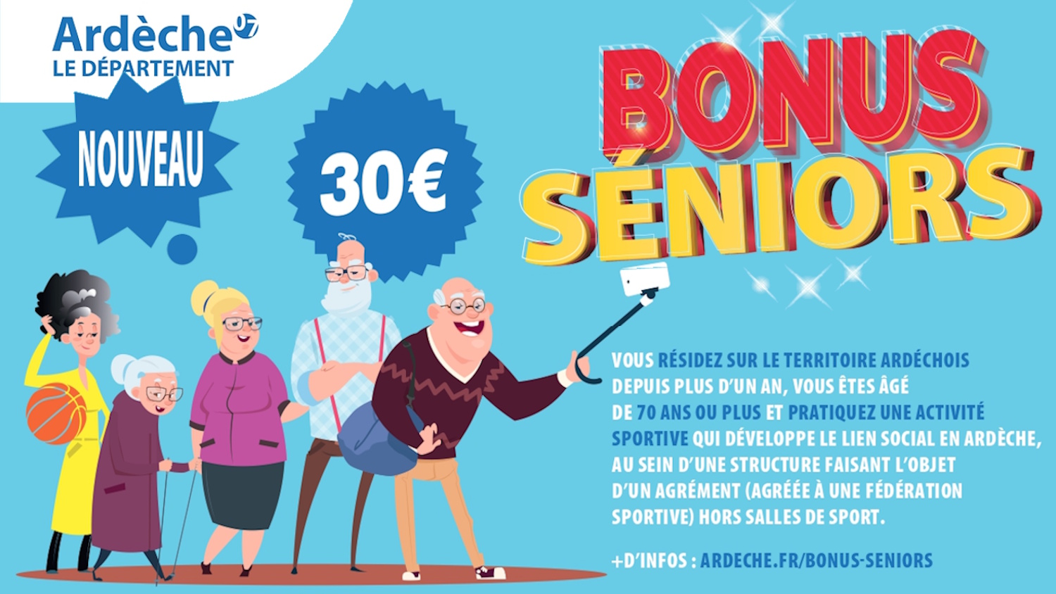 Nous comptons sur vous pour faire connaître ce Bonus Sénior à vos administrés, adhérents et/ou licenciés des clubs sportifs afin qu’un grand nombre d’Ardéchois puisse en bénéficier. Pour toute question, nous vous invitons à adresser un message à l’adresse mail suivante : bonus.seniors@ardeche.fr