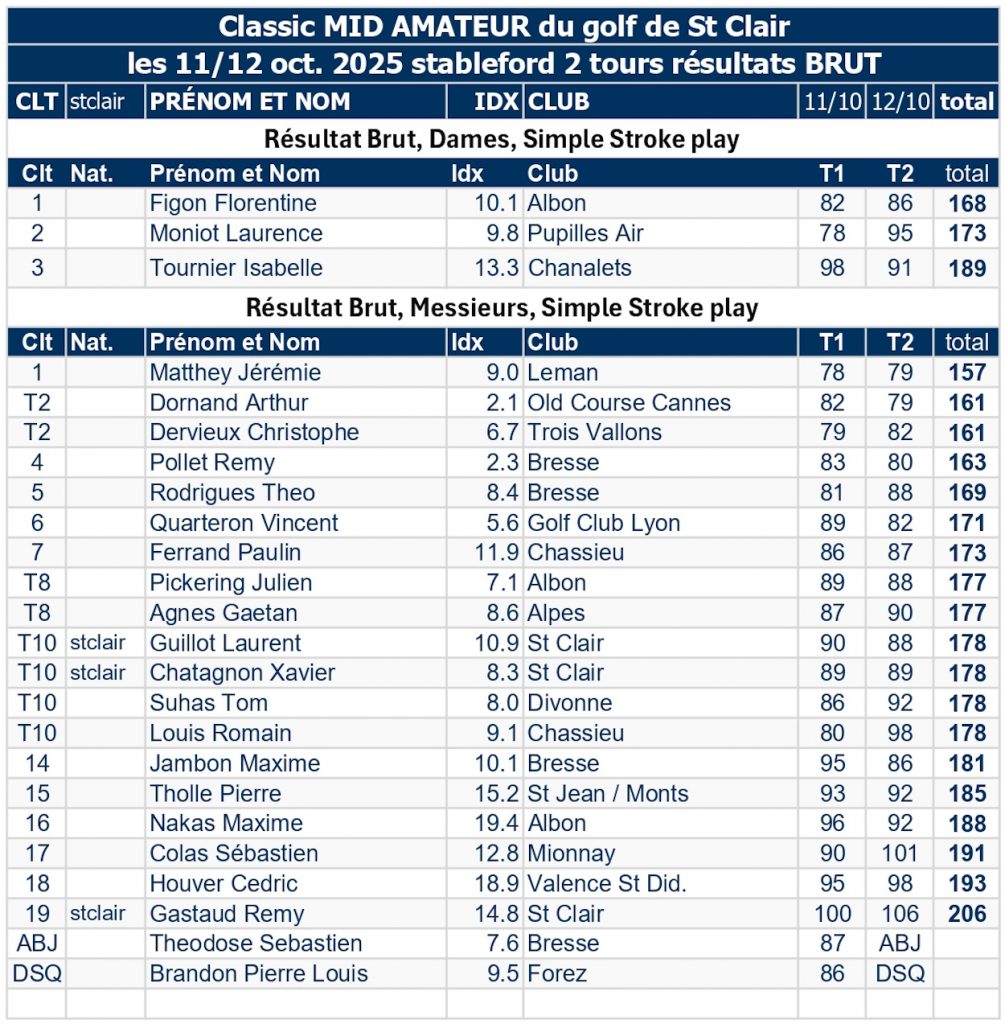 Le CLASSIC MID-AMATEUR de ST CLAIR le samedi 11 et dimanche 12 octobre 2025 se déroule donc sur 2 fois 18 trous en Strokeplay.