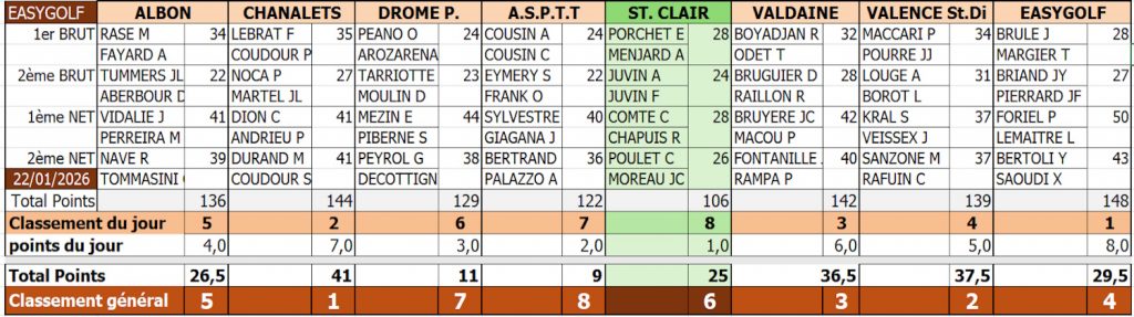 Pour cette journée, EasyGolf s’est hissé en tête du classement par club, suivi des Chanalets et de La Valdaine. Au classement général, aucun changement n’est à signaler : les Chanalets, Valence Saint Didier et La Valdaine conservent leurs positions respectives. En revanche, la journée a été difficile pour Saint Clair, qui termine dernier du classement du jour et rétrograde de la 4e à la 6e place au général.