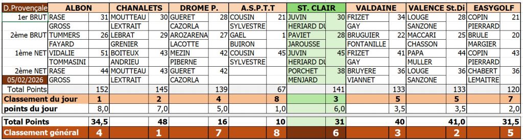 La toute dernière étape se fera à Valence St Didier le 19 février et St Clair affrontera EasyGolf pour la 5ème place de cette HIVERNALE SENIORS 2025-2026.