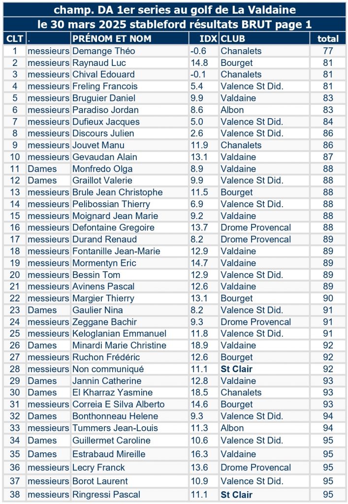 Ce samedi 21 mars 2025 s’est tenu au golf de la Valdaine le championnat Drôme-Ardèche, 1ère série en individuel et par équipe, Dames et messieurs. 59 participants : 17 golfeuses et 42 golfeurs se sont retrouvés pour le titre 2026 en Stableford ; belle journée golfique avec un climat printanier, sans l’habituel vent de notre vallée du Rhône et un superbe soleil A cela il convient d’ajouter un terrain manucuré.