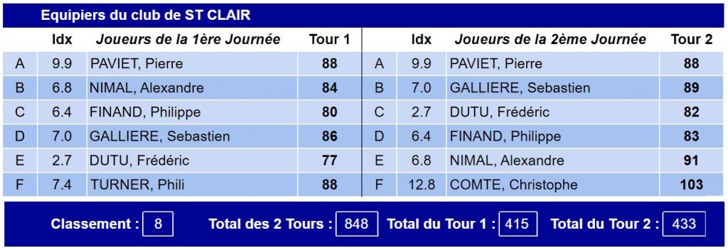 Le samedi 21 : superbe journée printanière sur un parcours de St Didier très bien préparé et termine 8ème ; le lendemain, dimanche 22, St Clair n’a pu que conserver sa place. Meilleurs scores de chaque jour à Frédéric Dutu (77 et 82pts).