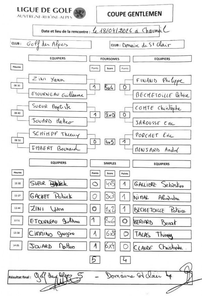Après un excellent début d’après-midi avec trois victoires consécutives (Sébastien Galliere, Ales Nimal et Patrice Bechetoille), St Clair perd les trois matchs suivants et s’incline finalement d’un point face au golf des Alpes.