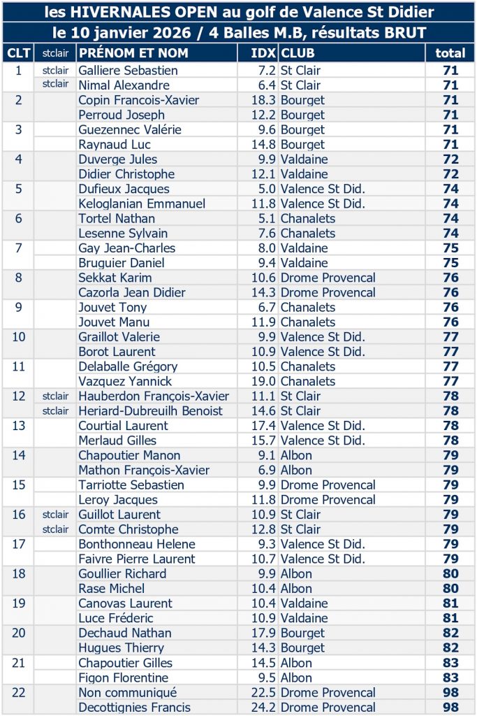 > Du jour par club : 1er : La Valdaine, suivi par St Clair; 3ème, Les Chanalets.