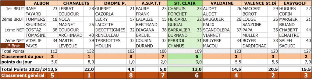 Le classement par club de la journée place les Chanalets en tête avec 136 points, suivis par Valence St Didier et La Valdaine. Au classement général, La Valdaine conserve la première place, suivie de Valence St Didier et des Chanalets.
