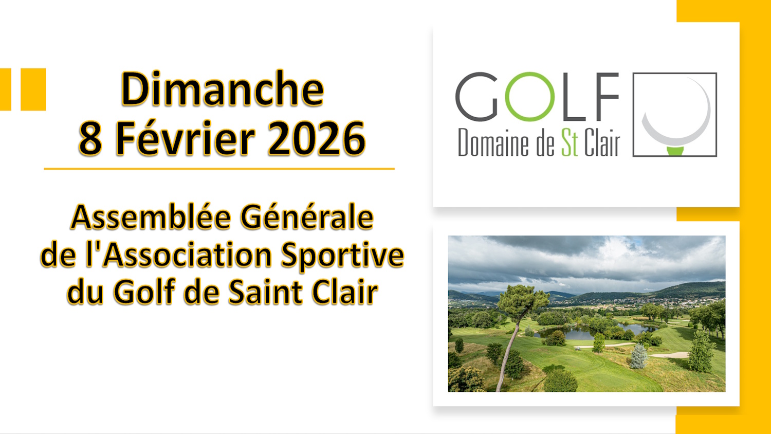 La prochaine ASSEMBLEE GENERALE ORDINAIRE de l’Association Sportive du Golf du domaine de Saint-Clair se tiendra le DIMANCHE 8 FEVRIER 2026 à partir de 17h dans la grande salle du Domaine