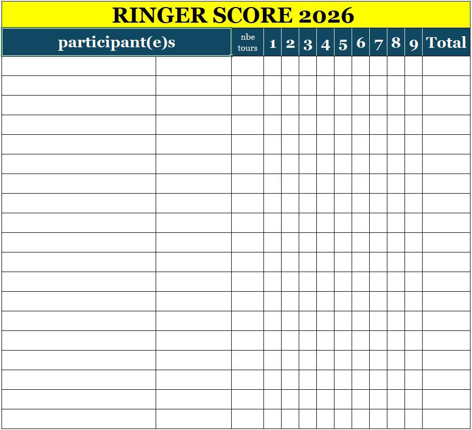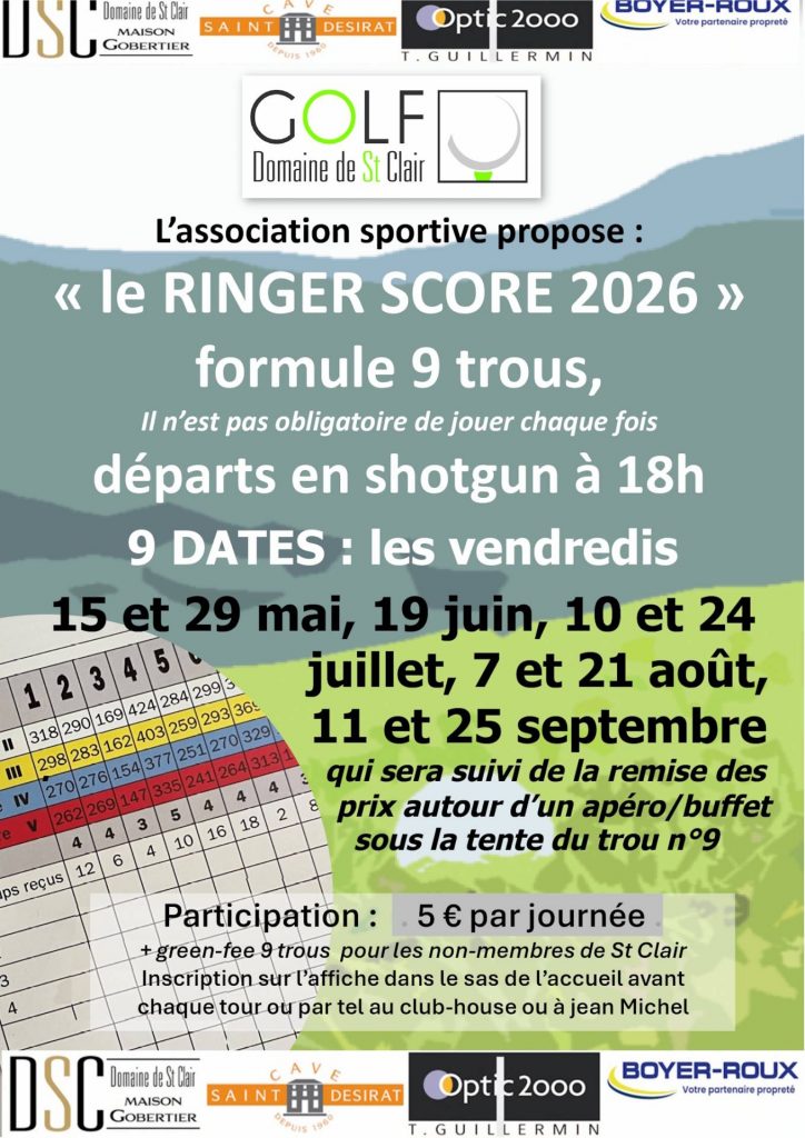 Le RINGER SCORE de l’été se joue sur les 9 premiers trous en « BRUT » du parcours de St Clair. Cette formule consiste à jouer plusieurs fois ce même parcours en ne retenant que le meilleur score réalisé sur chaque trou. Au fil des parties, la meilleure carte possible se constitue progressivement. Cette compétition est une formule ludique qui ne modifie en rien son index.